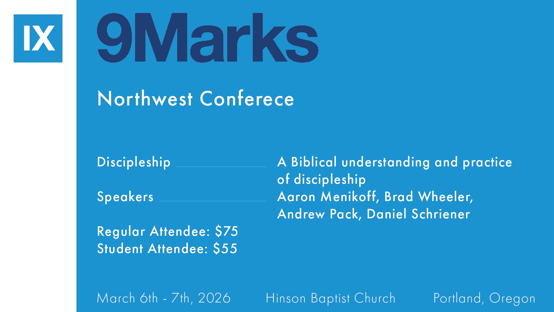 The 9Marks Northwest Conference is a way for Christians to learn about often-overlooked biblical practices for the church. The focus of this 2026 conference is the important topic of Discipling. Many evangelical Christians may have already formed opinions about discipleship informed by their good or bad experience of it in the local church. But what does the Bible say? And how should we practice healthy discipleship for the good of the church? This conference will be helpful to both vocational church leaders as well as lay leaders and congregants as we seek to encourage the breadth of the local church.